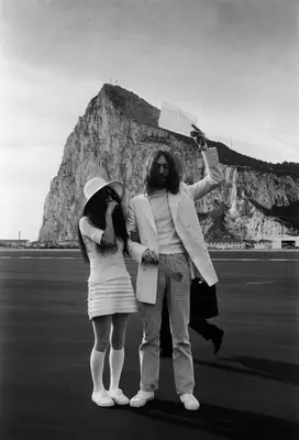 John Lennon og Yoko Ono, begge klædt i hvidt, med deres ægteskabsattest efter deres bryllup i Gibraltar, 20. marts 1969. (Foto af Simpson/Express (Getty Images)